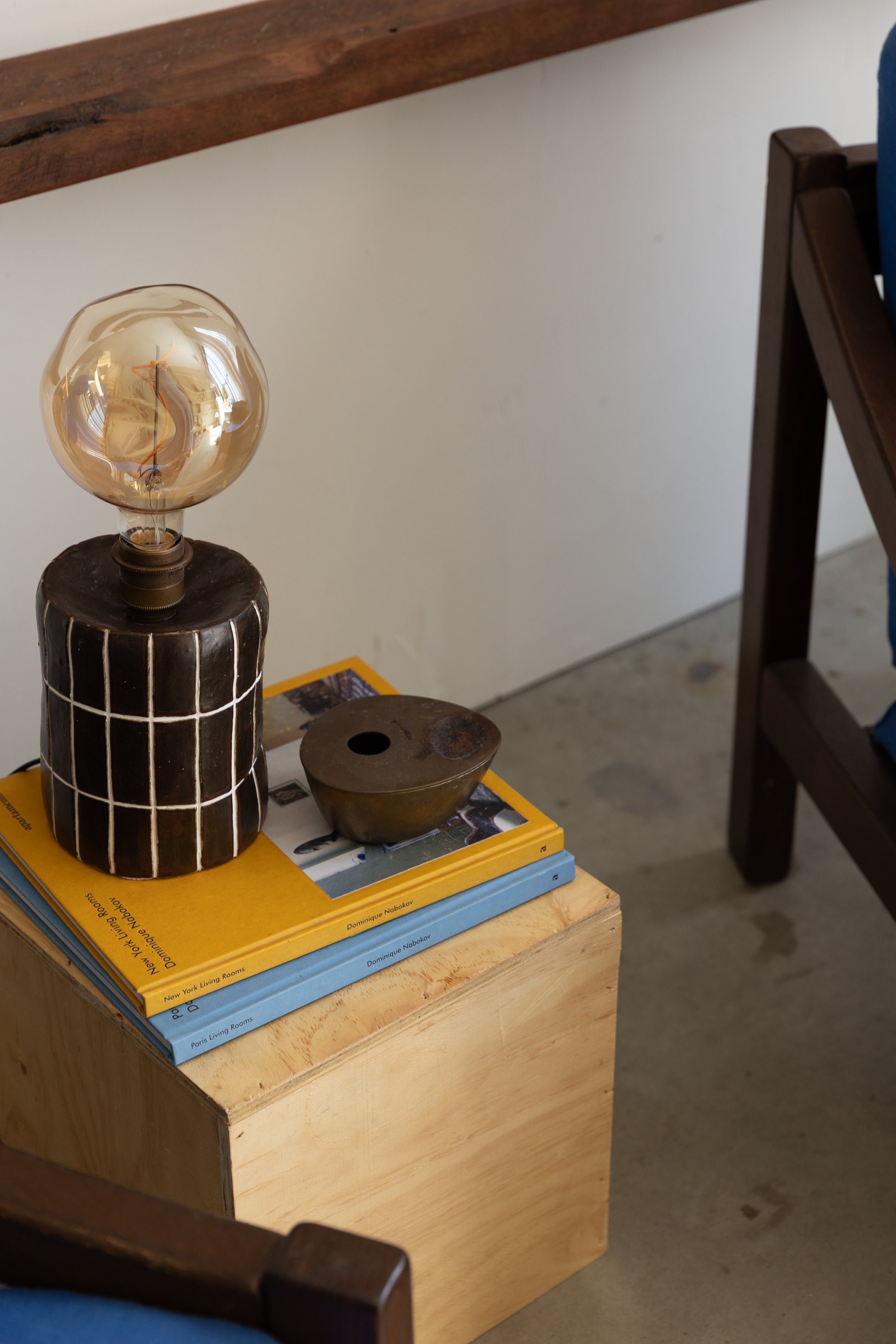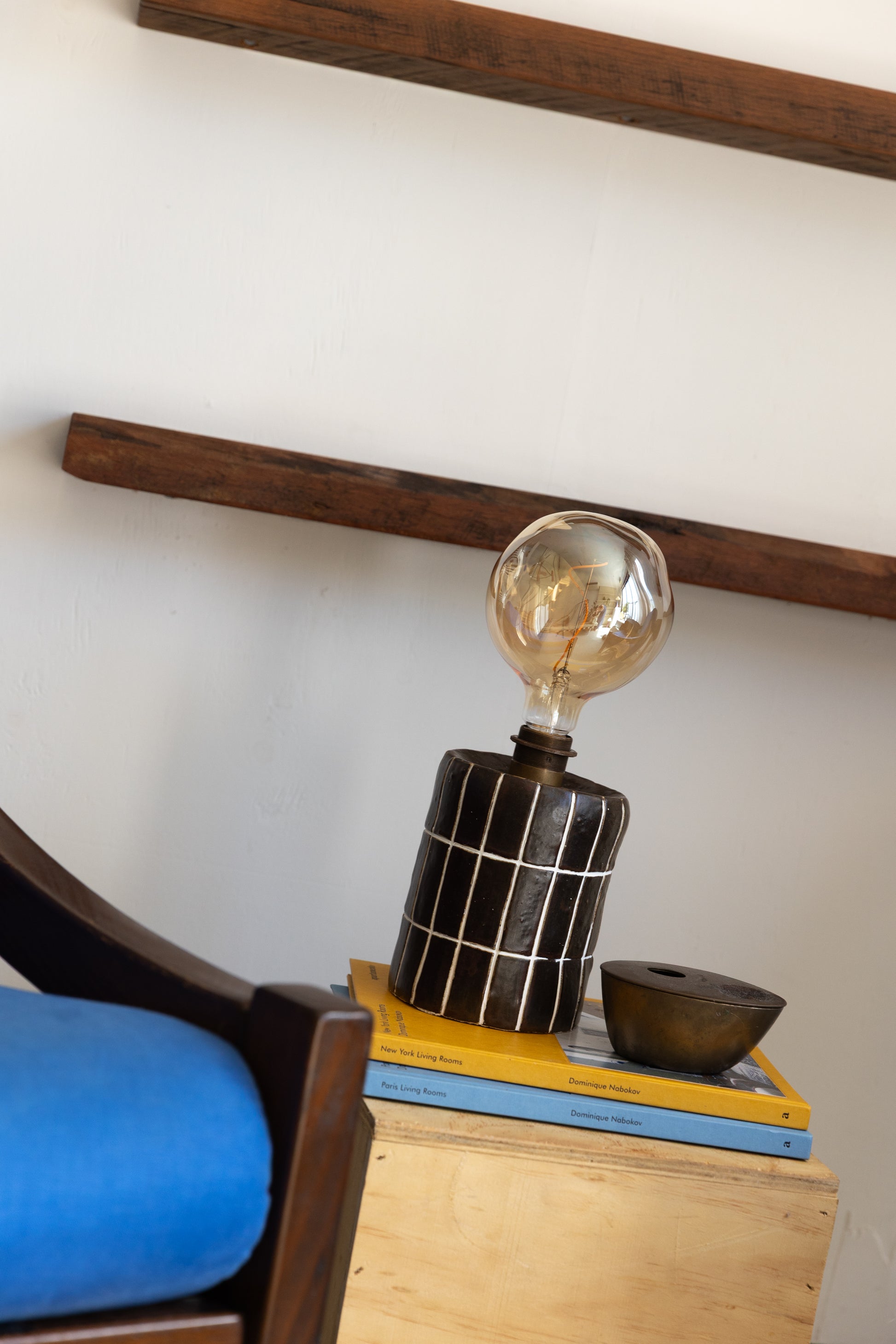 Her irregular amber globe above adds a soft, golden glow when lit, casting a warm, moody ambiance that enhances the rustic aesthetic.