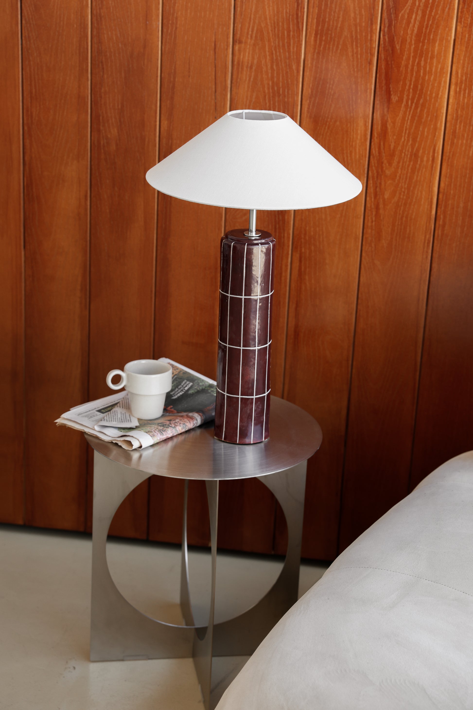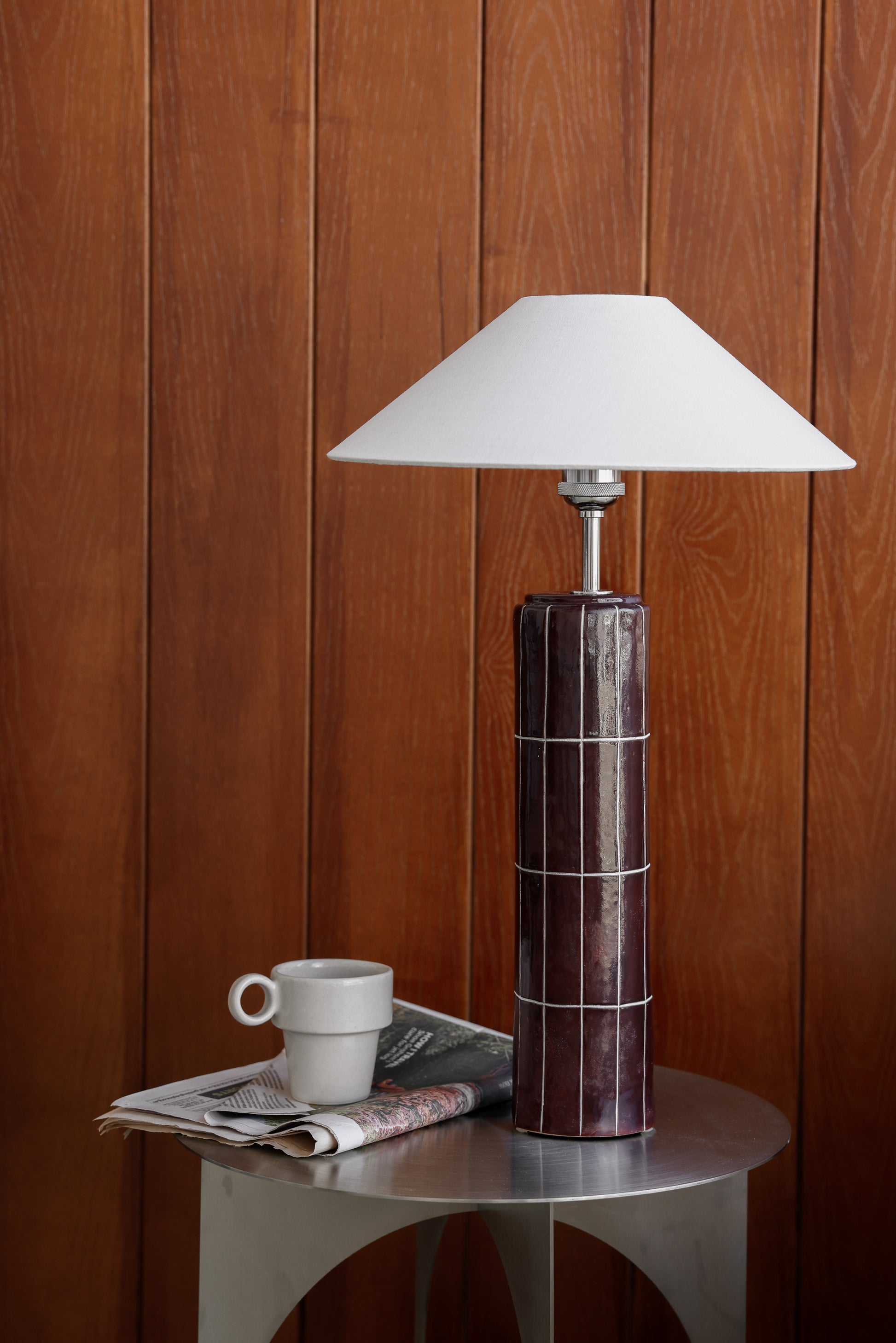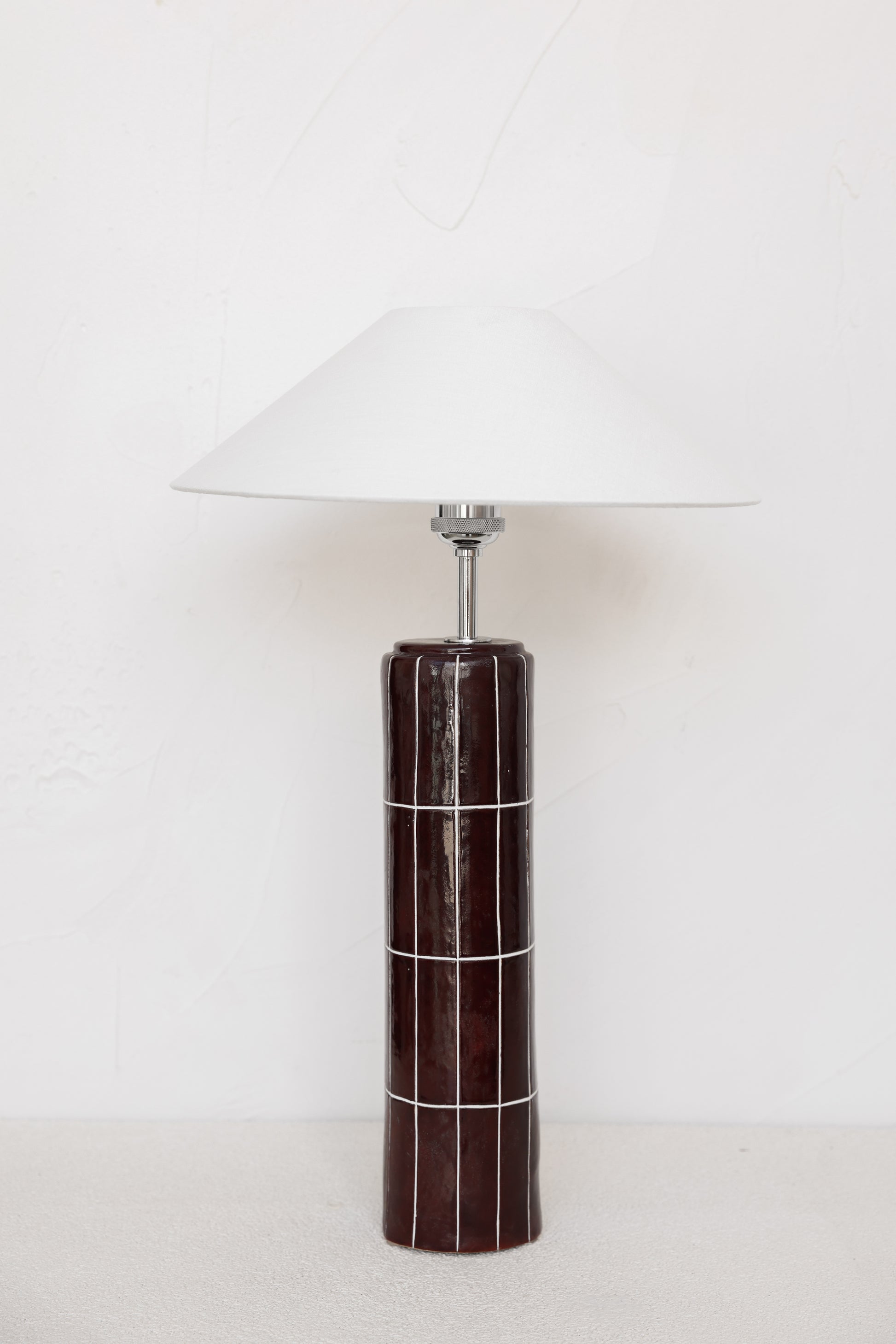The Coco Vintage lamp embodies elegance through its rich brown glaze that evokes warmth and luxury. Polished with chrome lighting components to create a sleek, modern contrast, and featuring a distinctive grout-lined tile design that adds subtle texture.