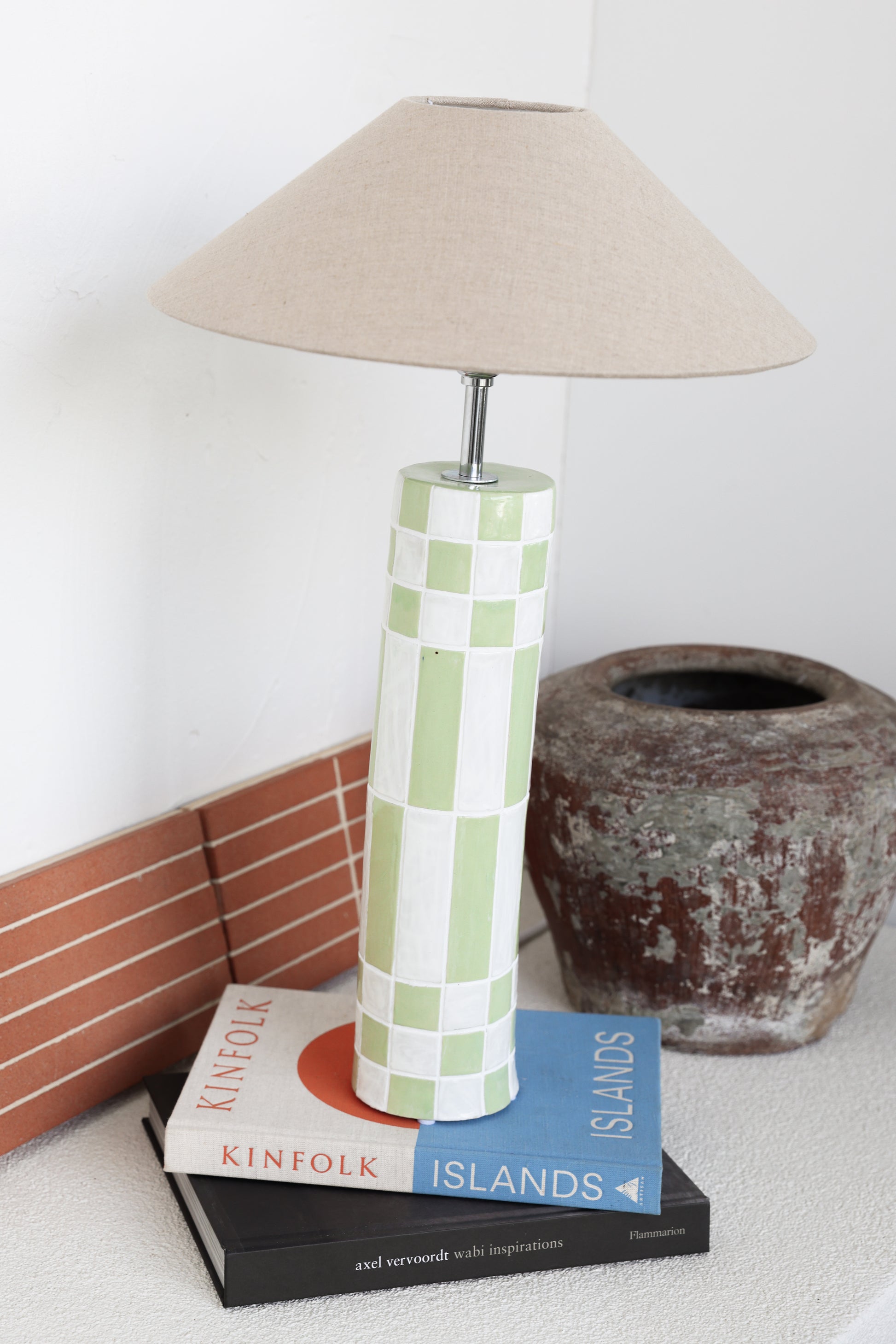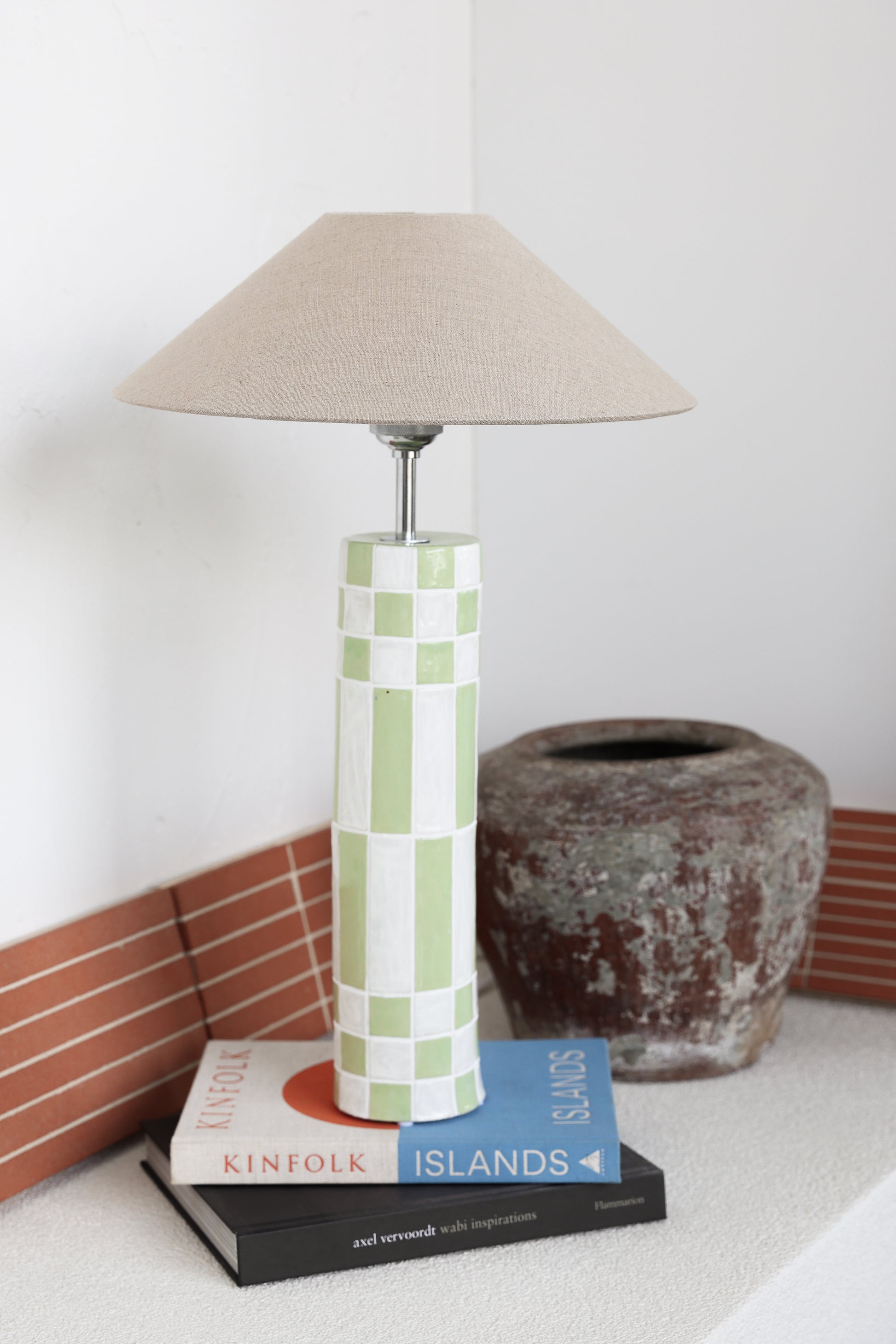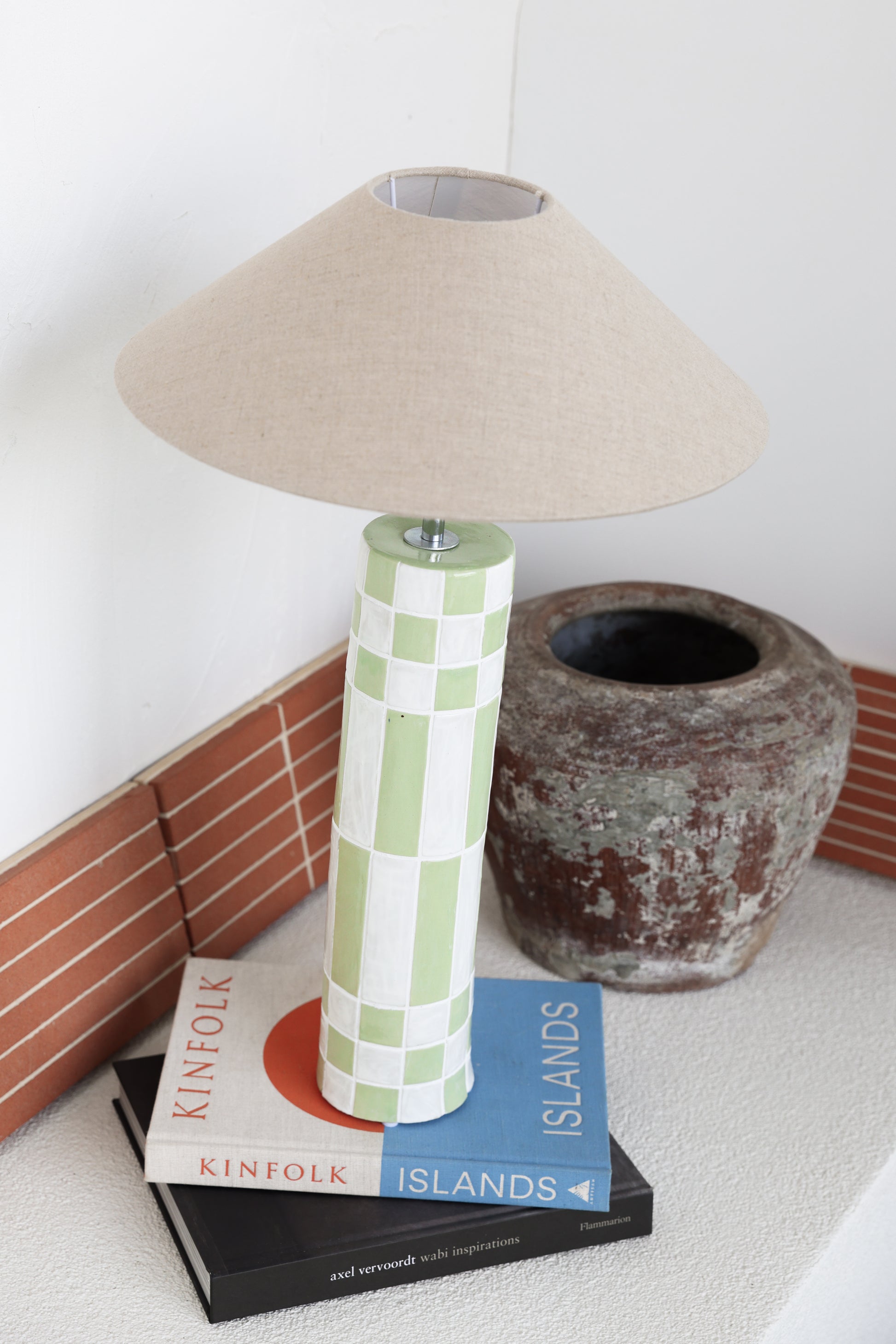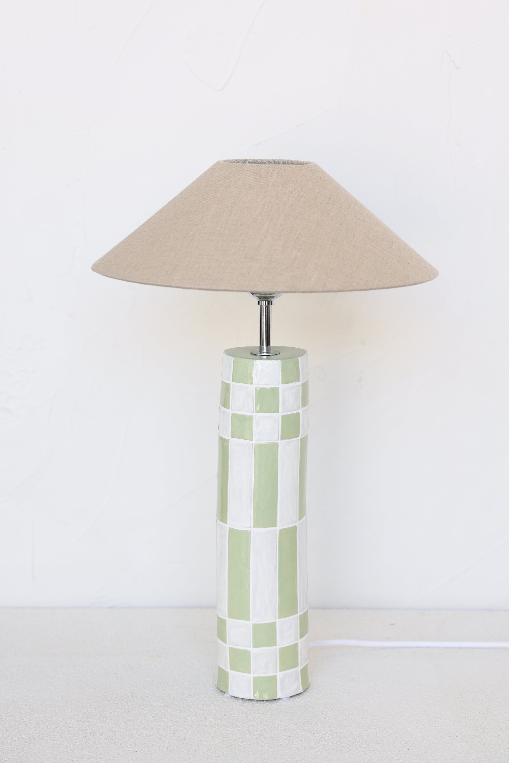 A soft nod to vintage charm, Sage & Bone pairs pastel green and white checks with a crisp classic linen shade and retro chrome details. Finished with a white cotton cable, she’s fresh, playful, and quietly nostalgic.