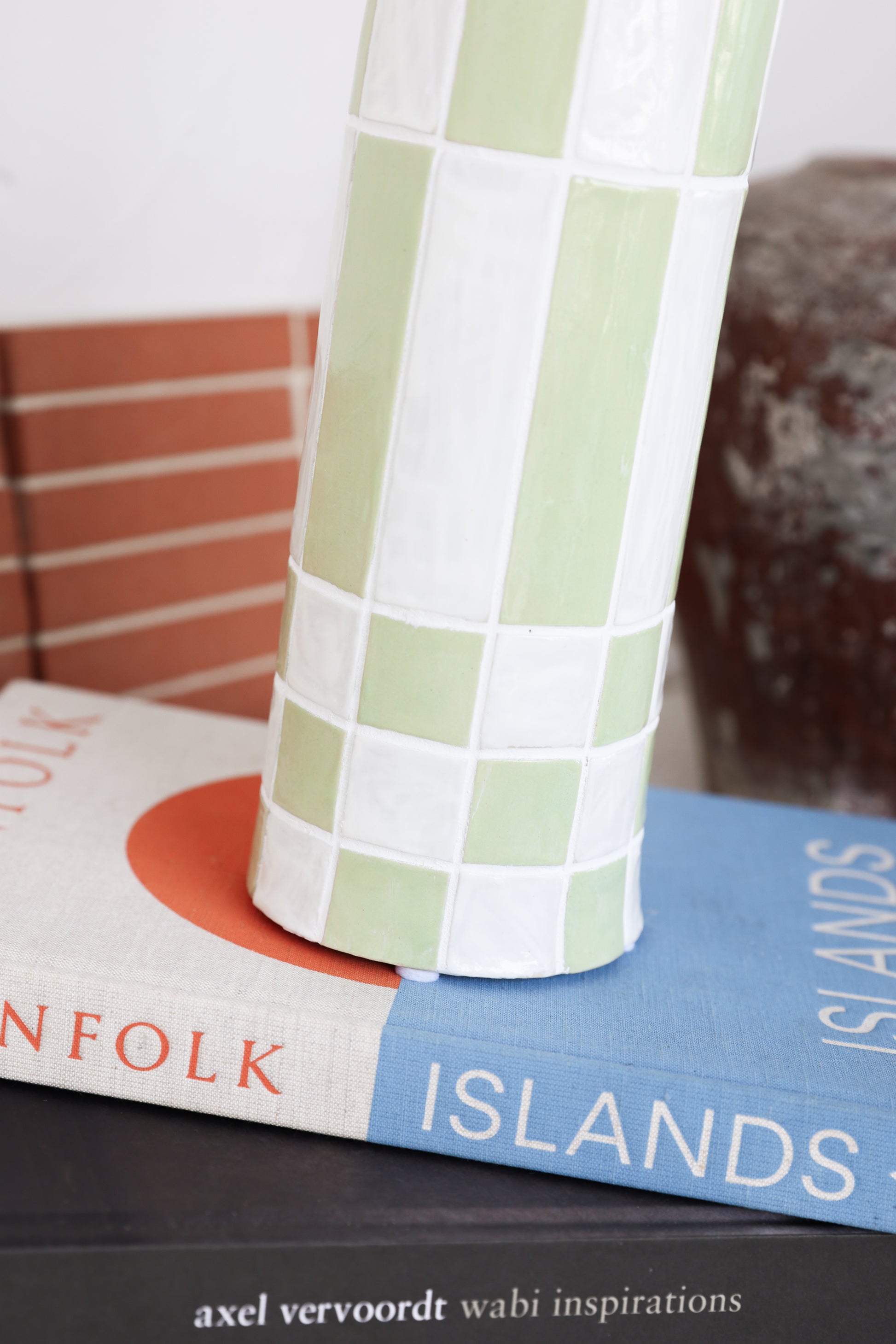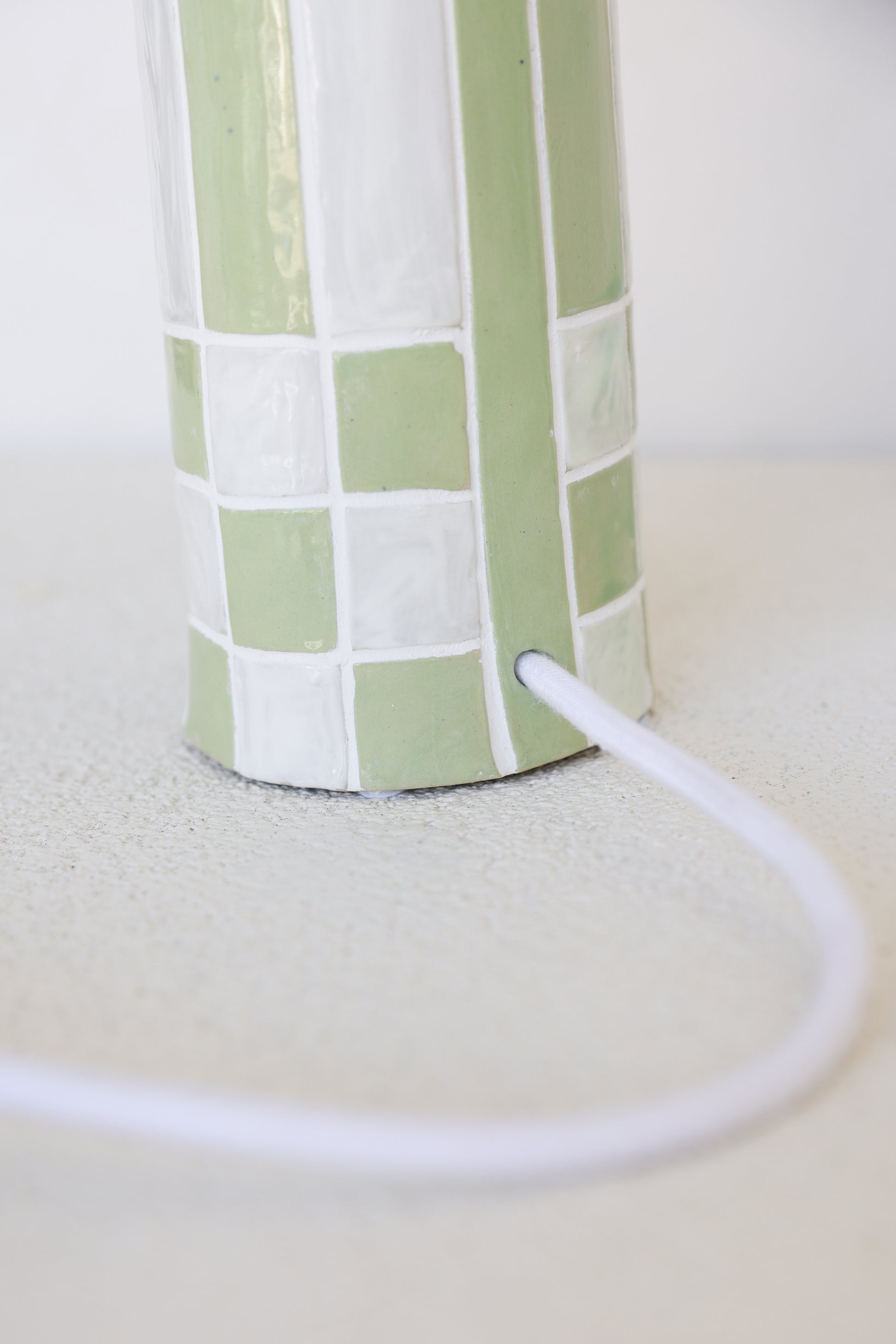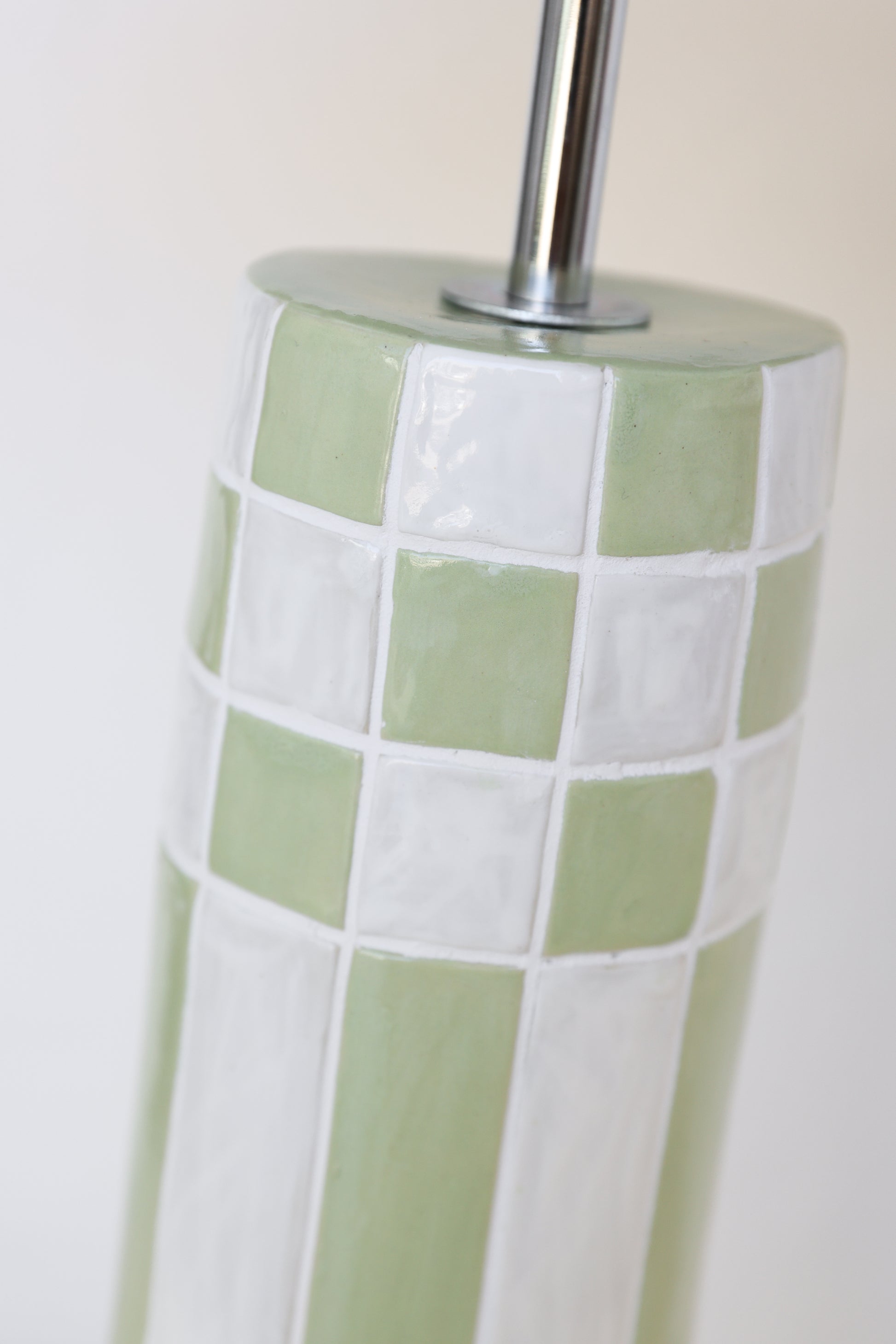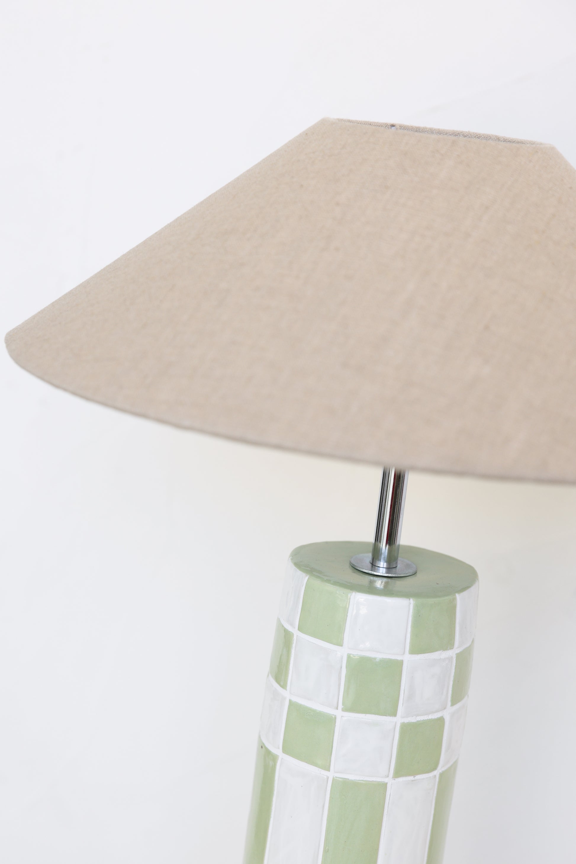 A soft nod to vintage charm, Sage & Bone pairs pastel green and white checks with a crisp classic linen shade and retro chrome details. Finished with a white cotton cable, she’s fresh, playful, and quietly nostalgic.