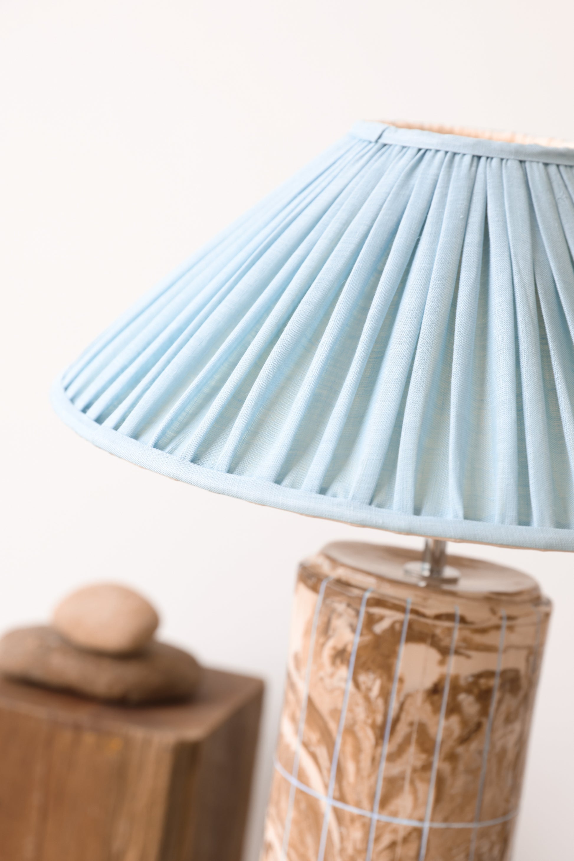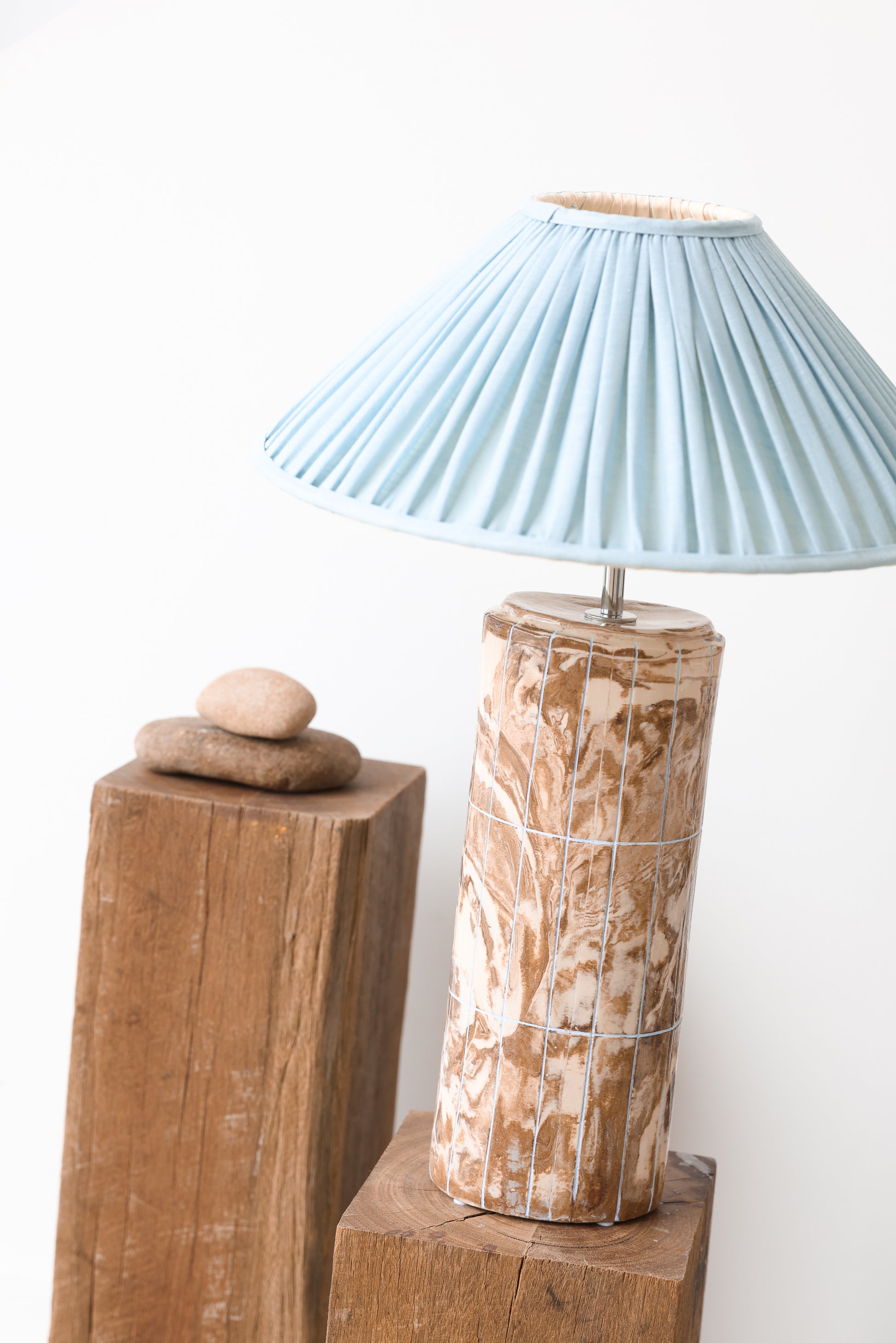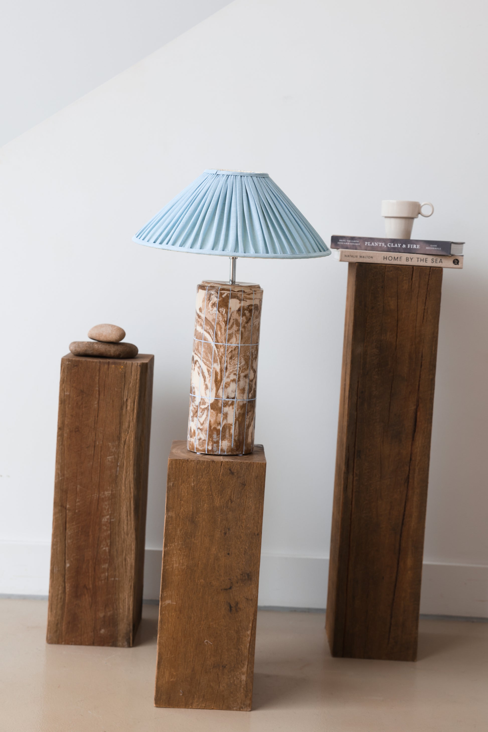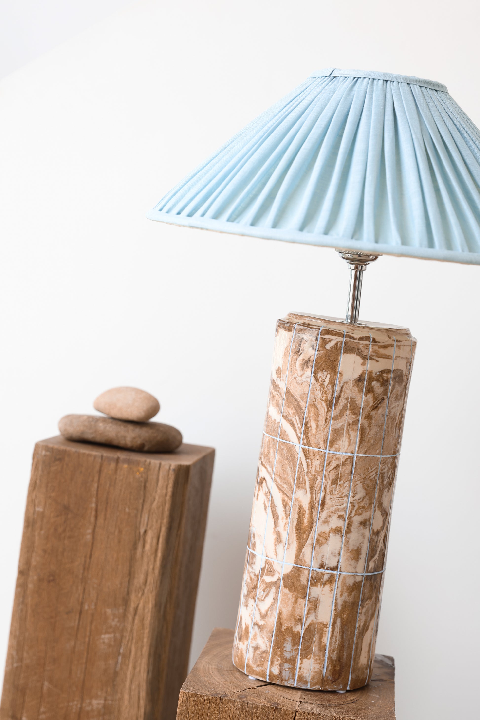 Solenne is where Earth meets sky. Her base is a mosaic of marbled, earthy tones—textured like stone worn smooth by time—held together by baby blue grout that threads through her like veins of calm. Topped with a matching blue linen shade, she glows softly, like morning light drifting across quiet hills.