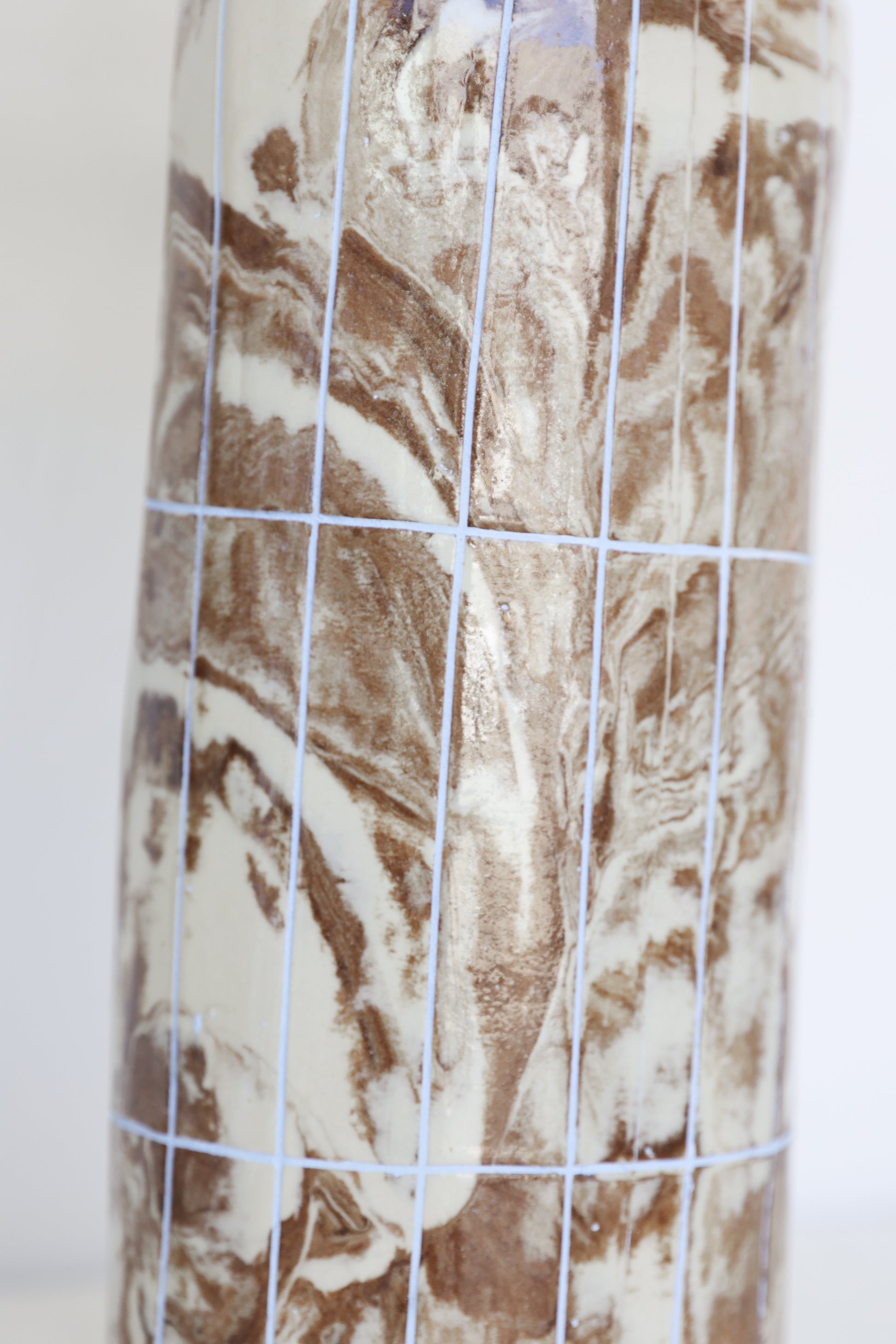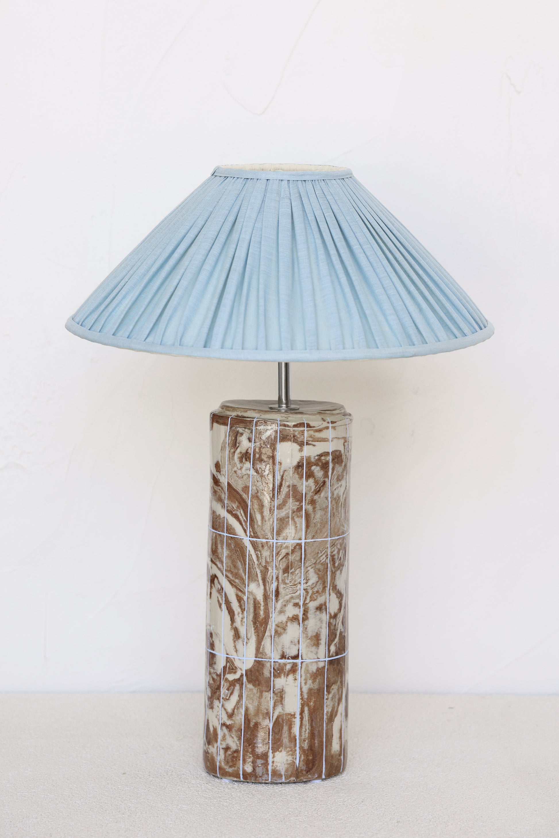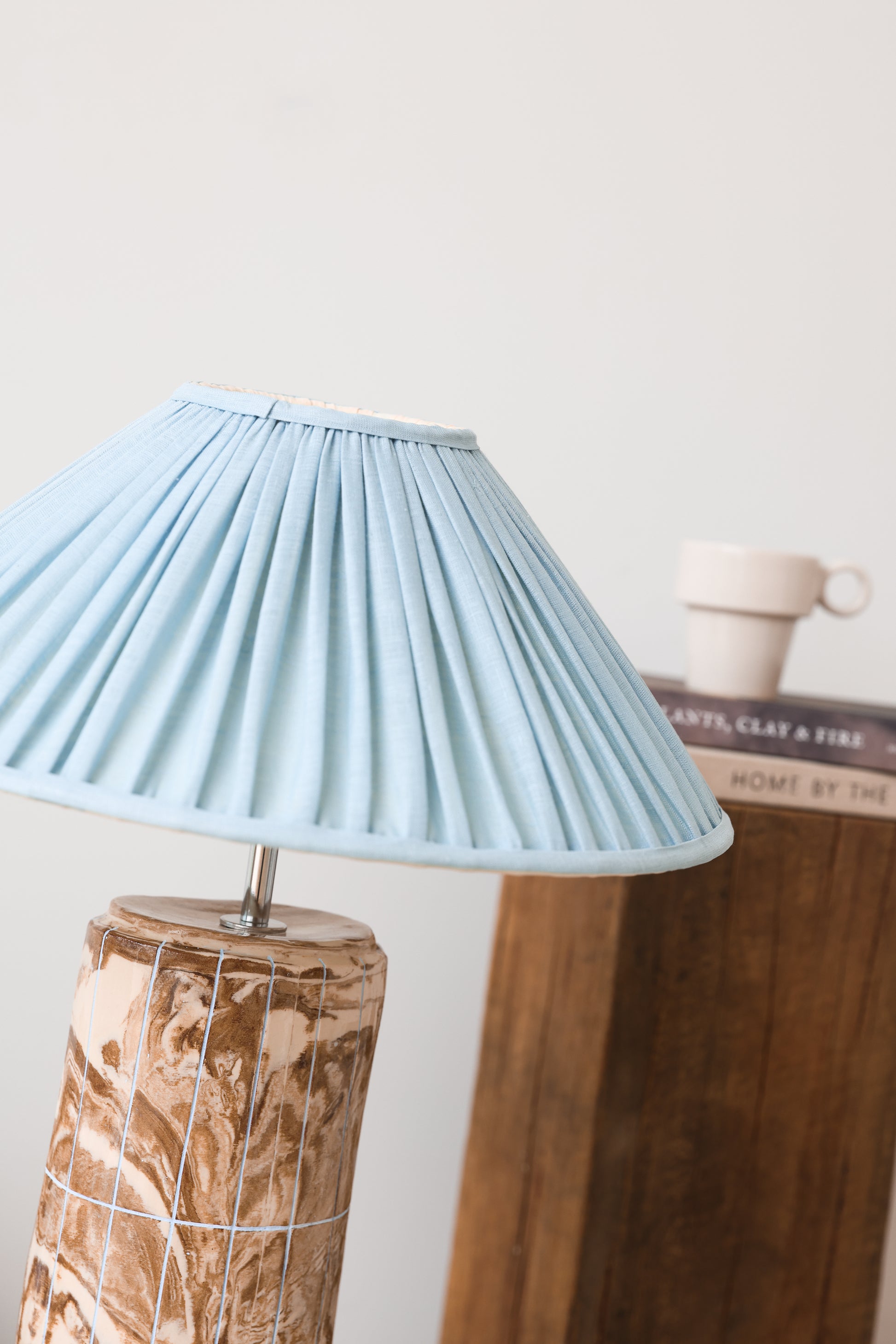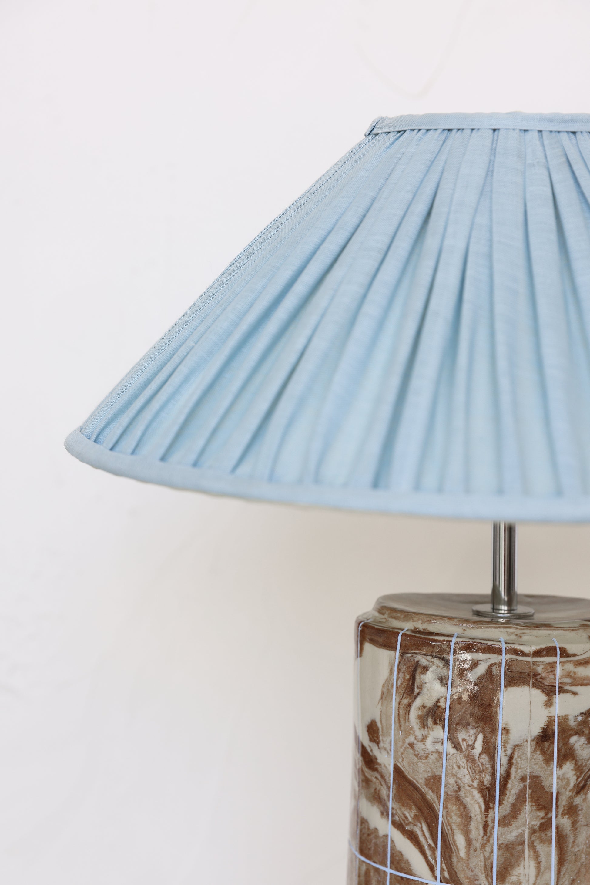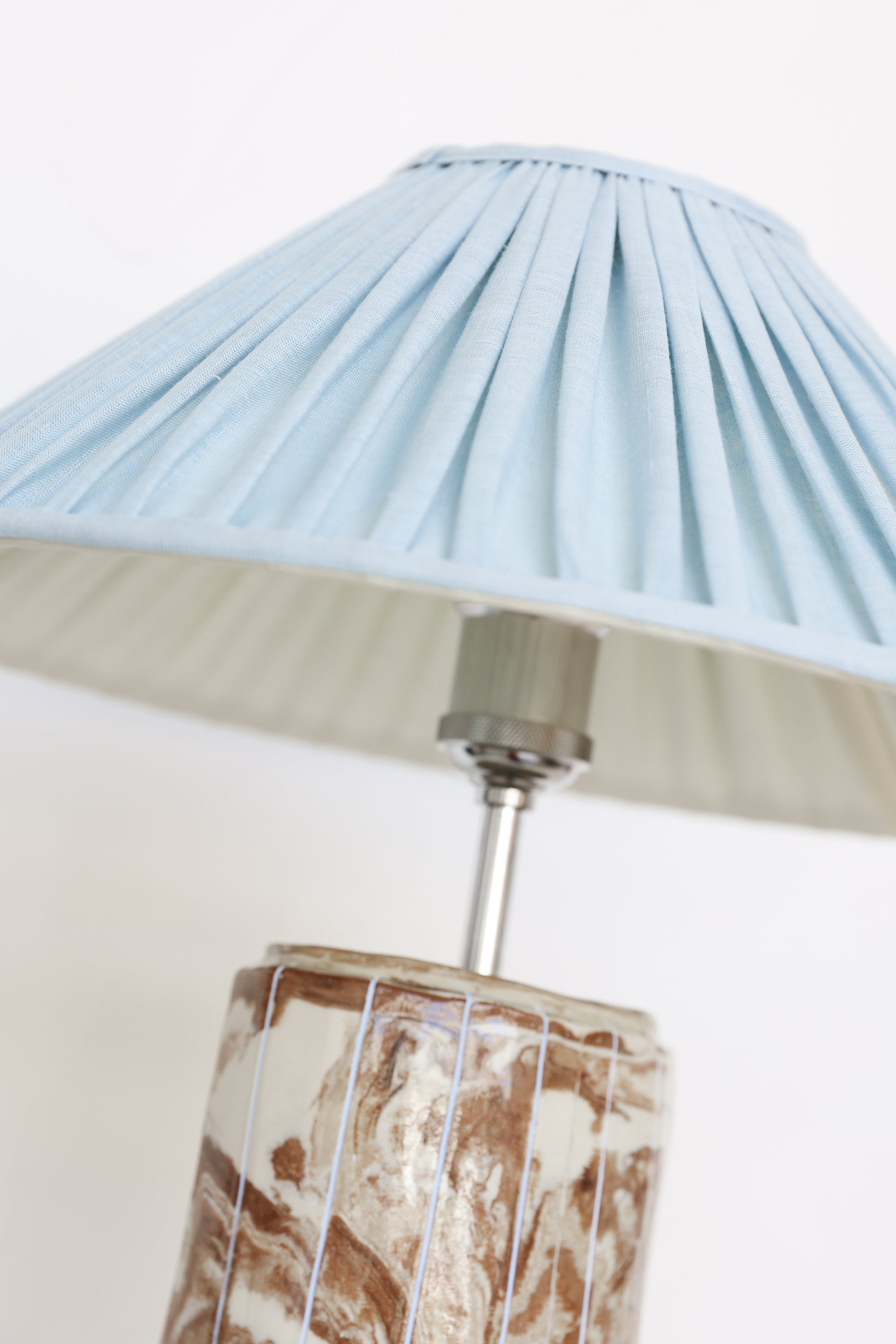 Solenne is where Earth meets sky. Her base is a mosaic of marbled, earthy tones—textured like stone worn smooth by time—held together by baby blue grout that threads through her like veins of calm. Topped with a matching blue linen shade, she glows softly, like morning light drifting across quiet hills.