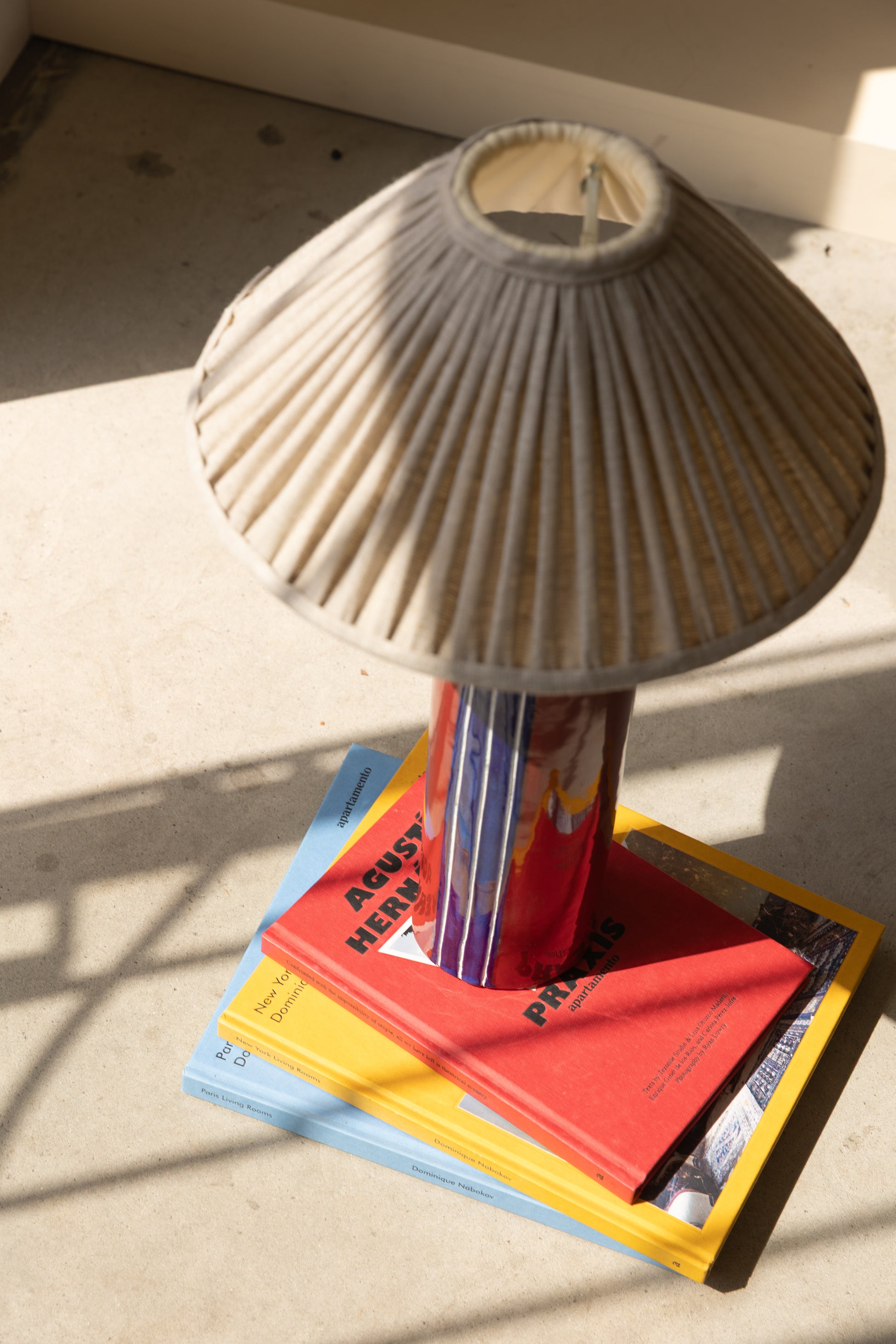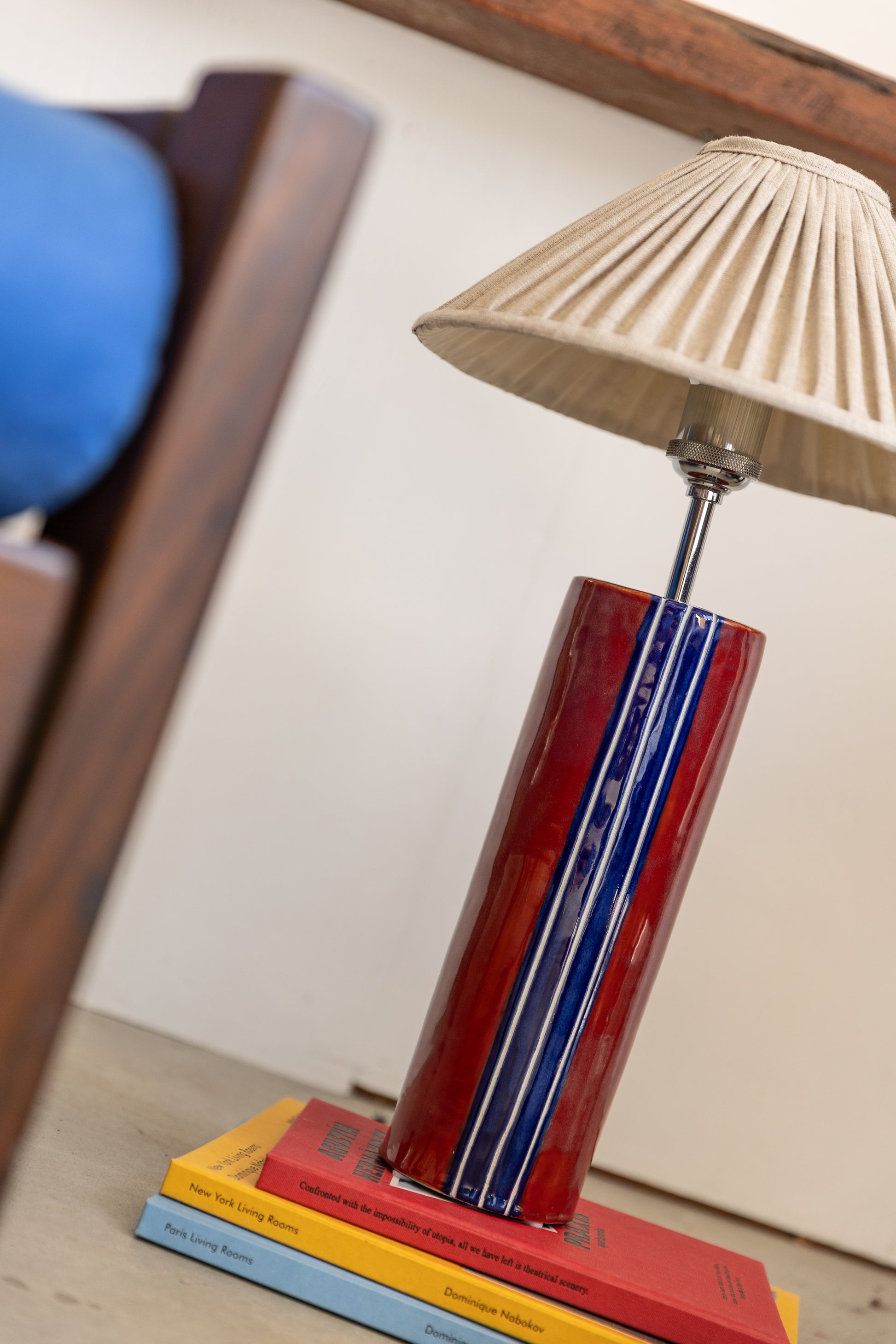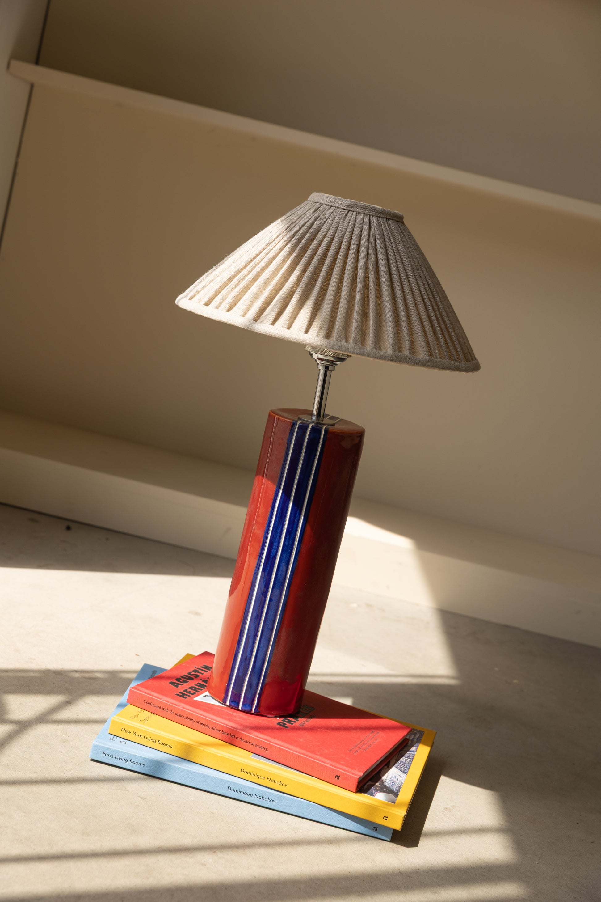 Draped in rich red and accented with royal blue lines, this lamp captures the drama and elegance of a bygone era. Her bold, nostalgic palette evokes the spirit of retro lounges and 1970s glam. Sleek chrome fittings add a modern touch of sophistication, while the classic linen shade completes the timeless look.