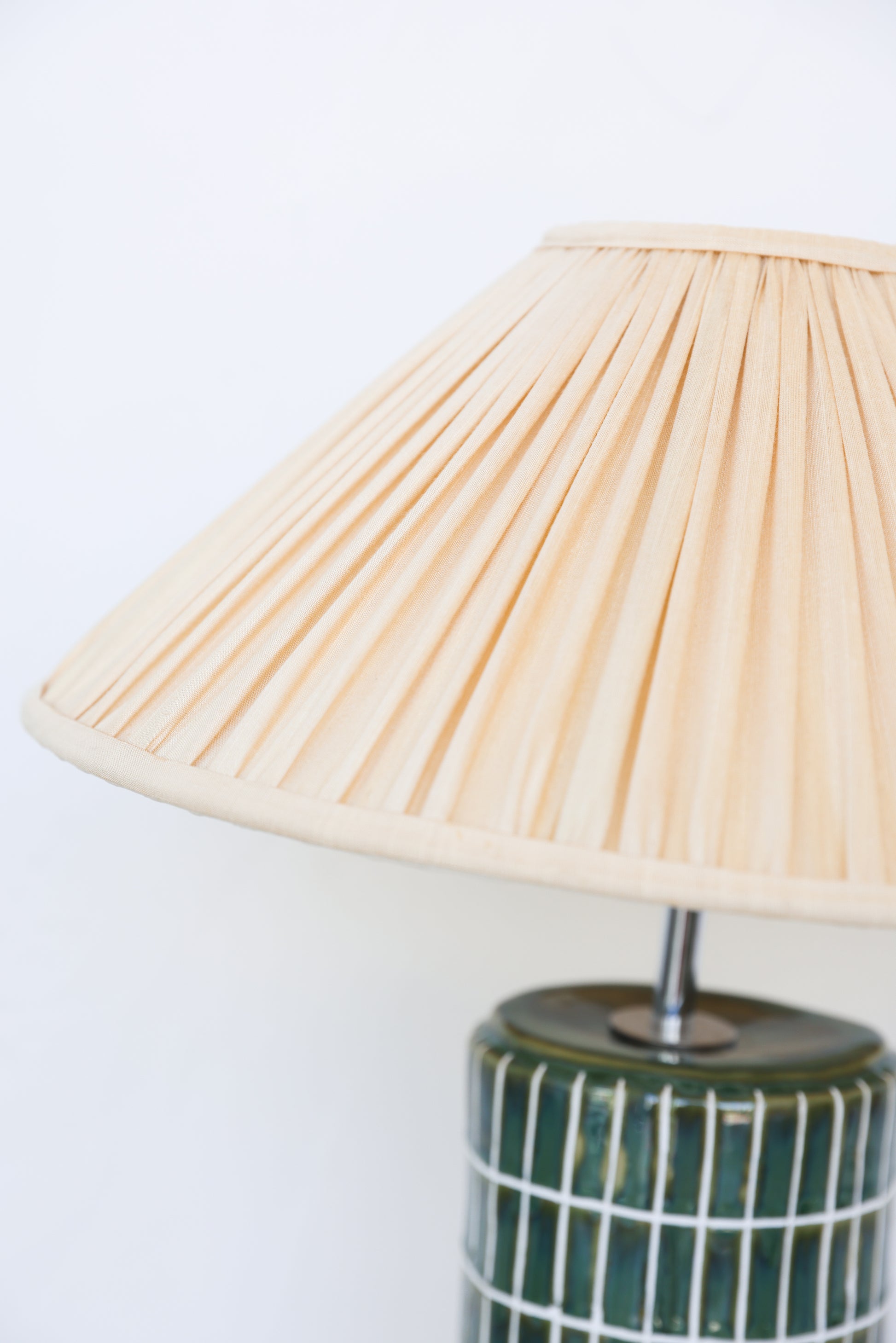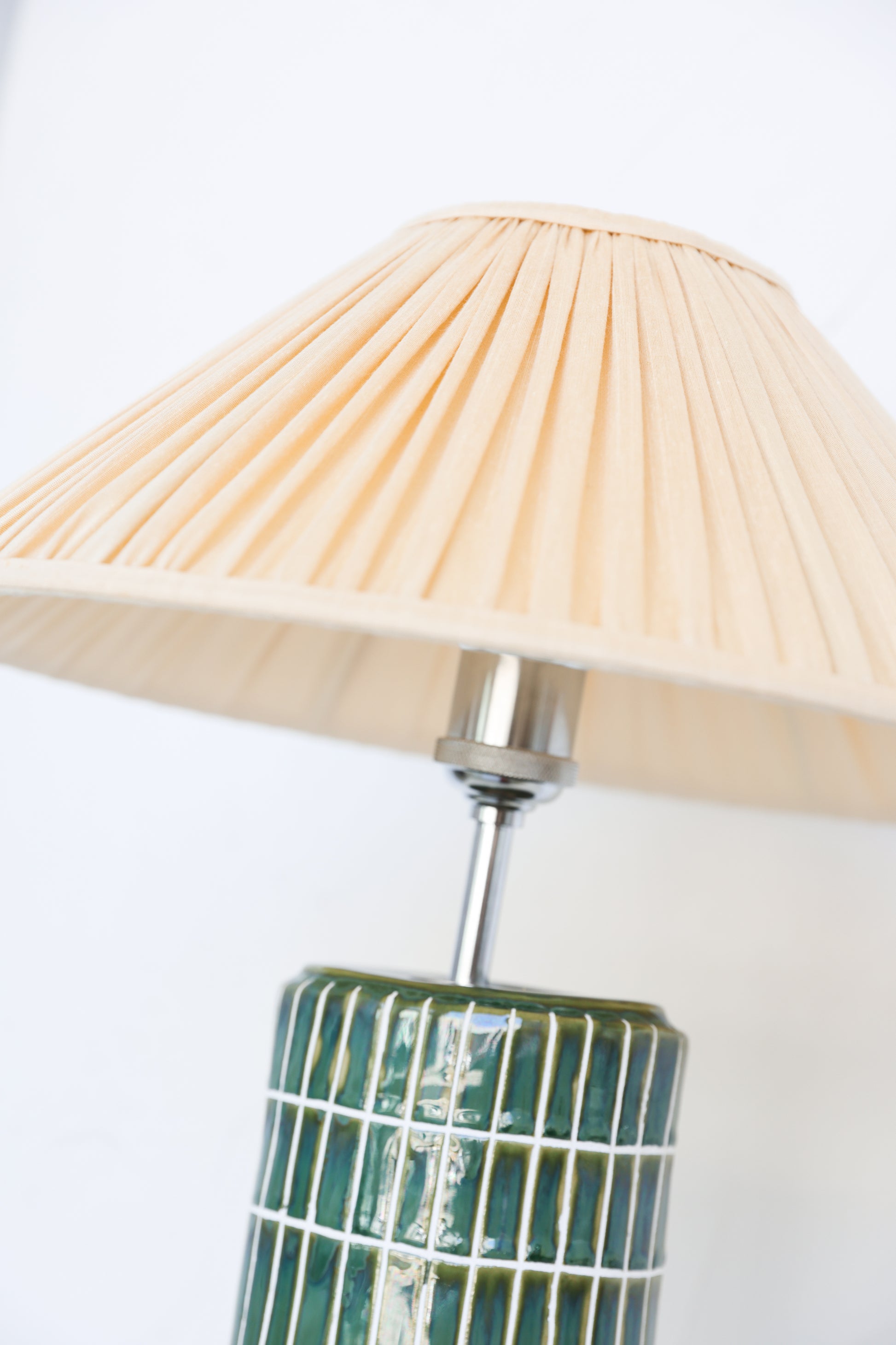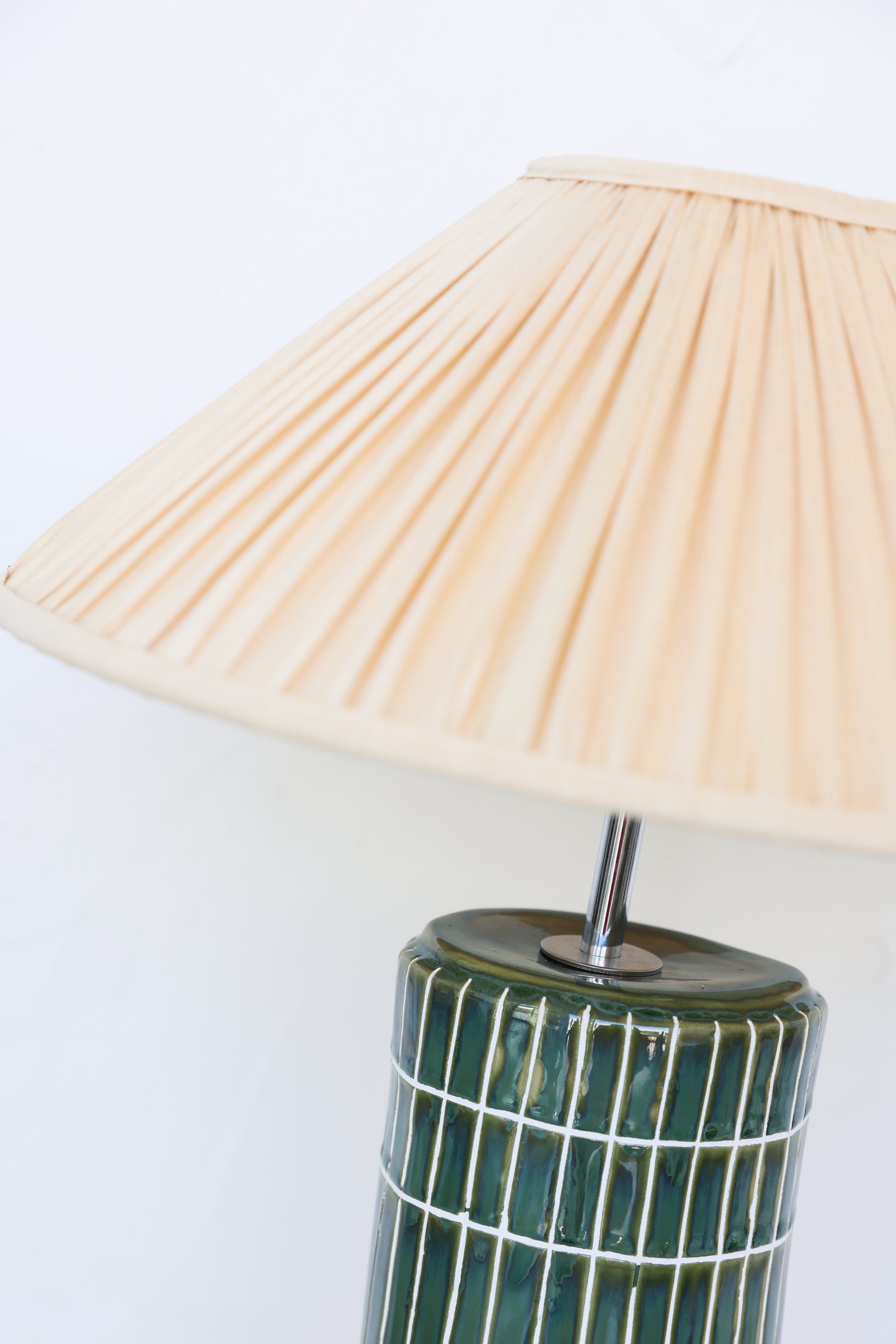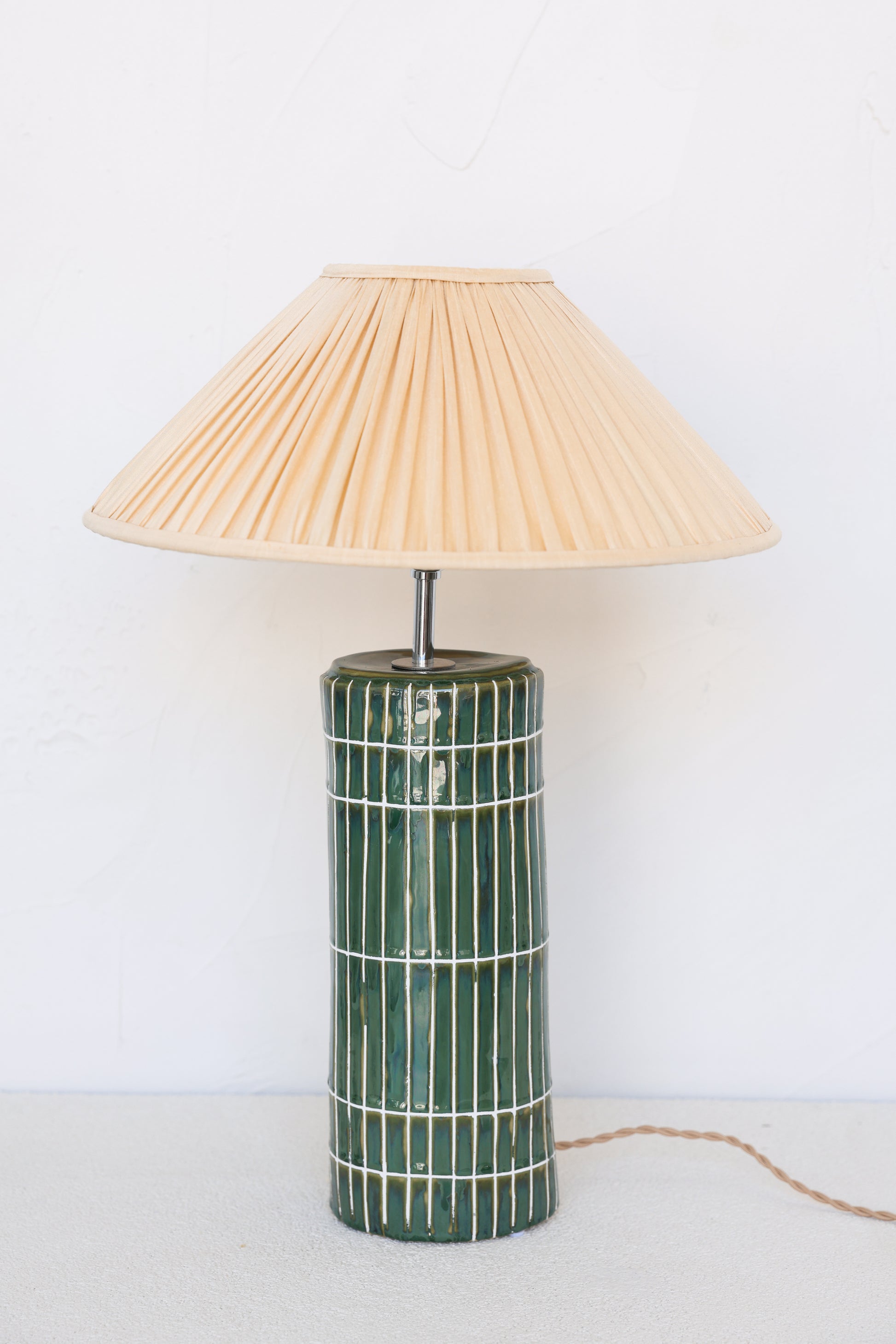 Viviana, pure light wrapped in elegance—vibrant like wild green hills after rain, and warm like the golden hush of late afternoon. She wears silk lemon blouses and emerald earrings, always effortlessly composed, always glowing. Her base, a deep emerald green, holds a quiet strength, while the buttercup silk shade above her casts a soft, sunlit glow.