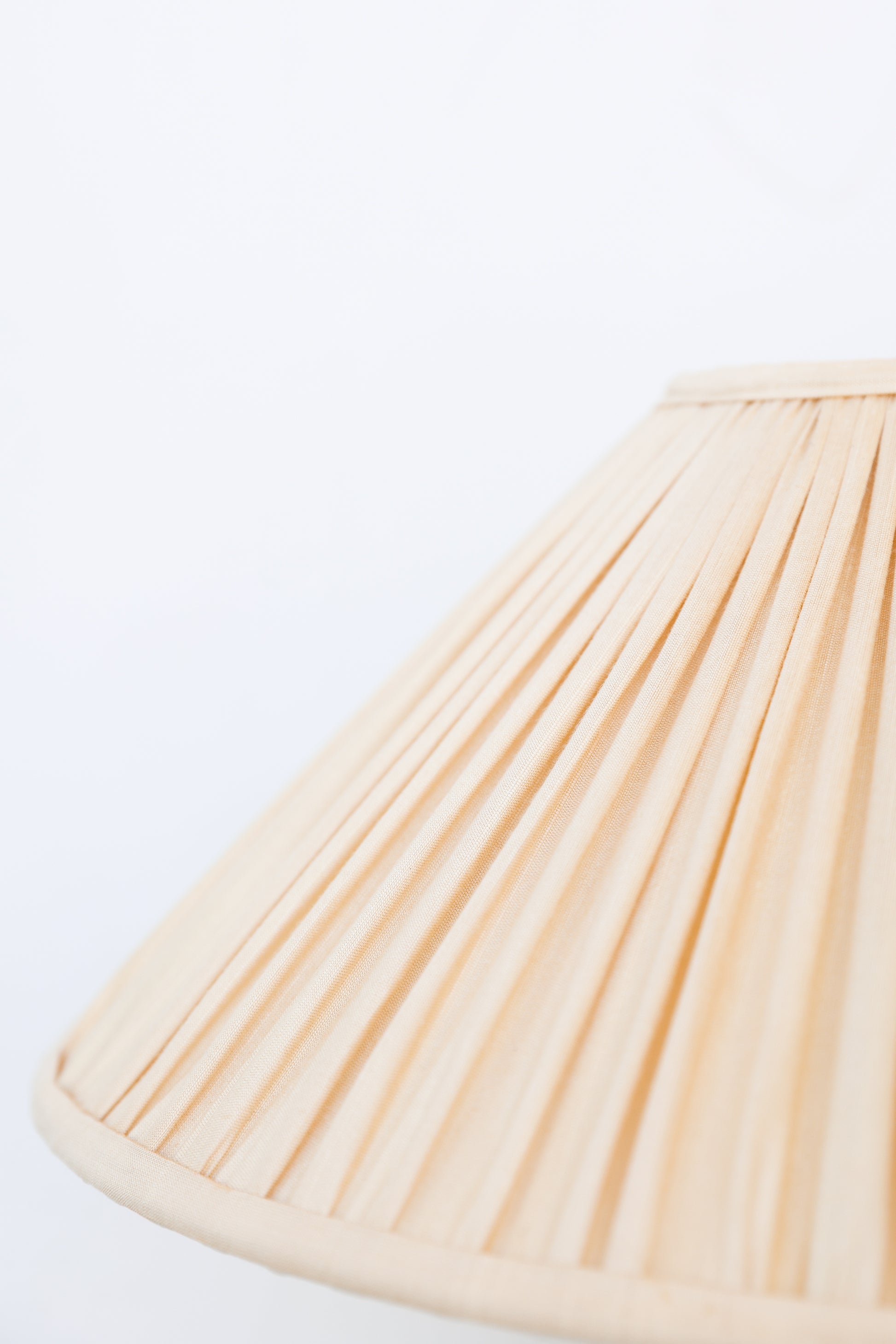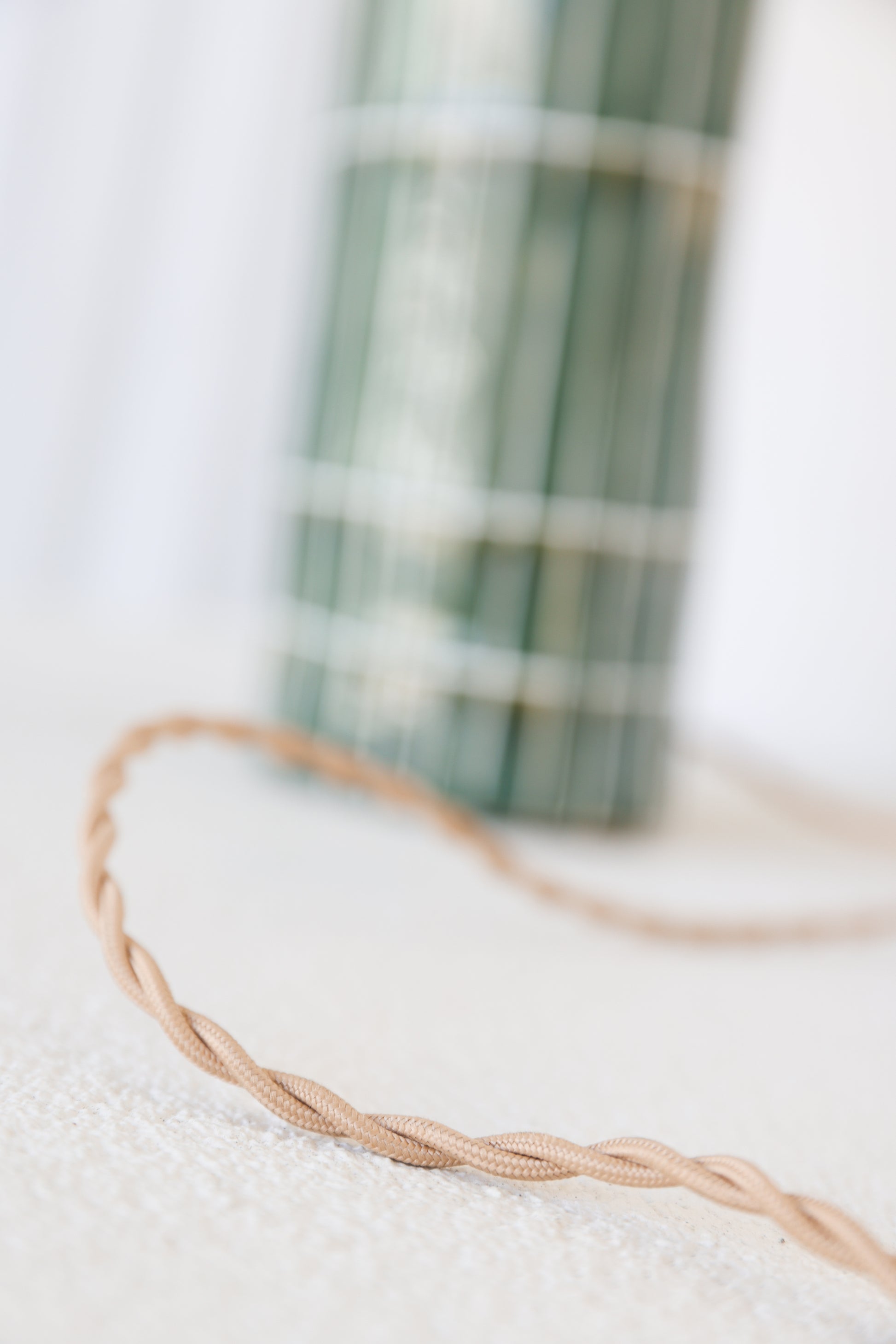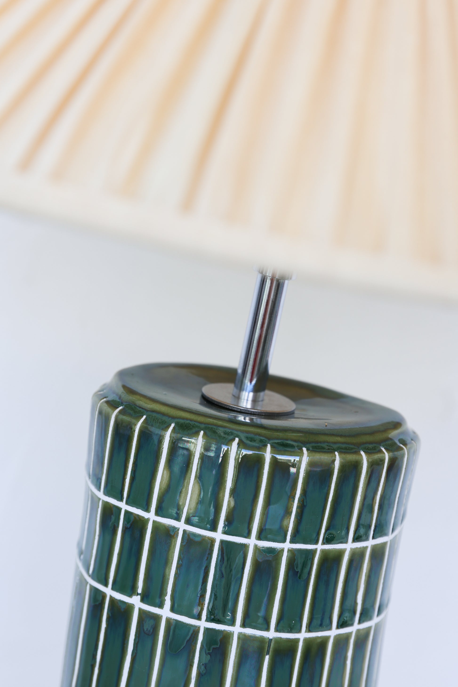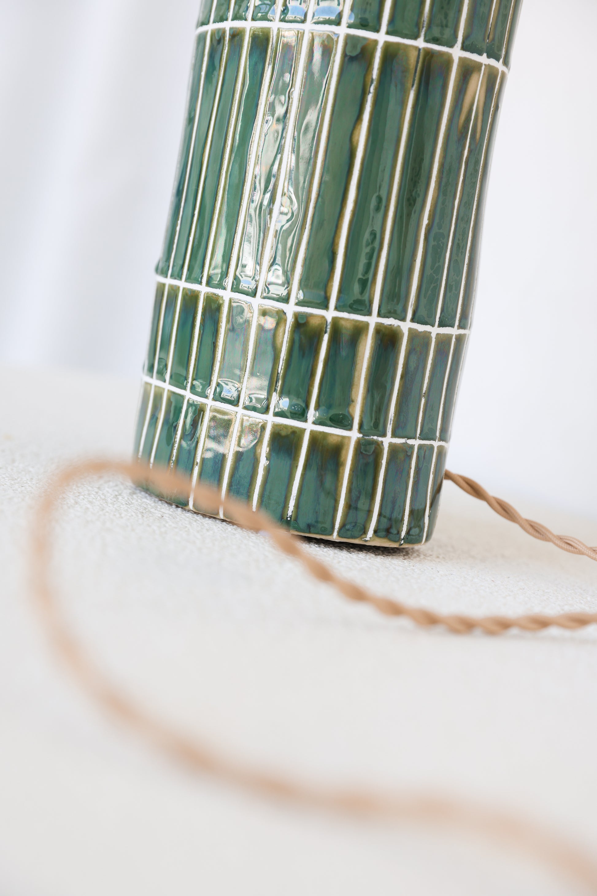 Viviana, pure light wrapped in elegance—vibrant like wild green hills after rain, and warm like the golden hush of late afternoon. She wears silk lemon blouses and emerald earrings, always effortlessly composed, always glowing. Her base, a deep emerald green, holds a quiet strength, while the buttercup silk shade above her casts a soft, sunlit glow.